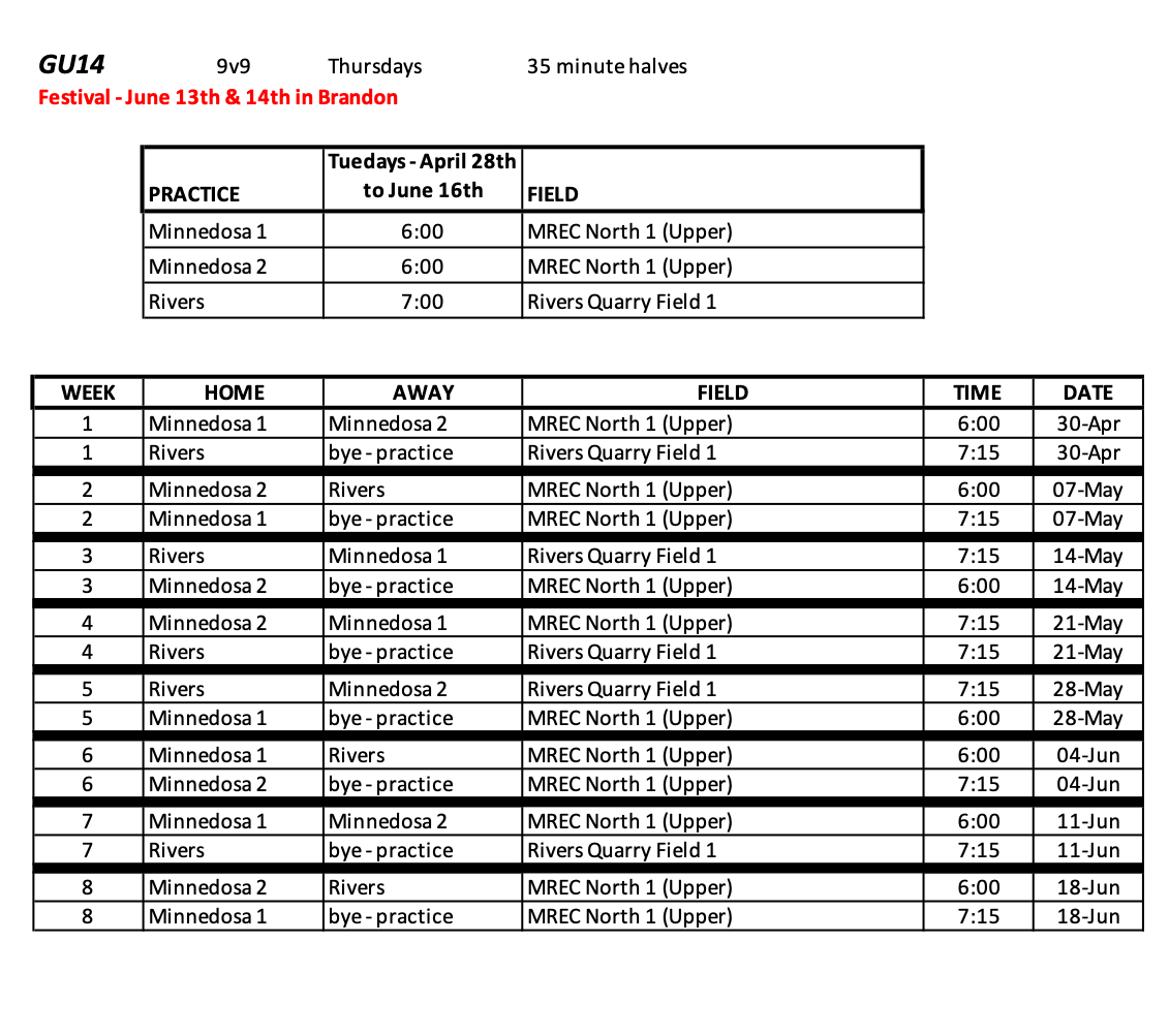 Girls U14 Schedule
